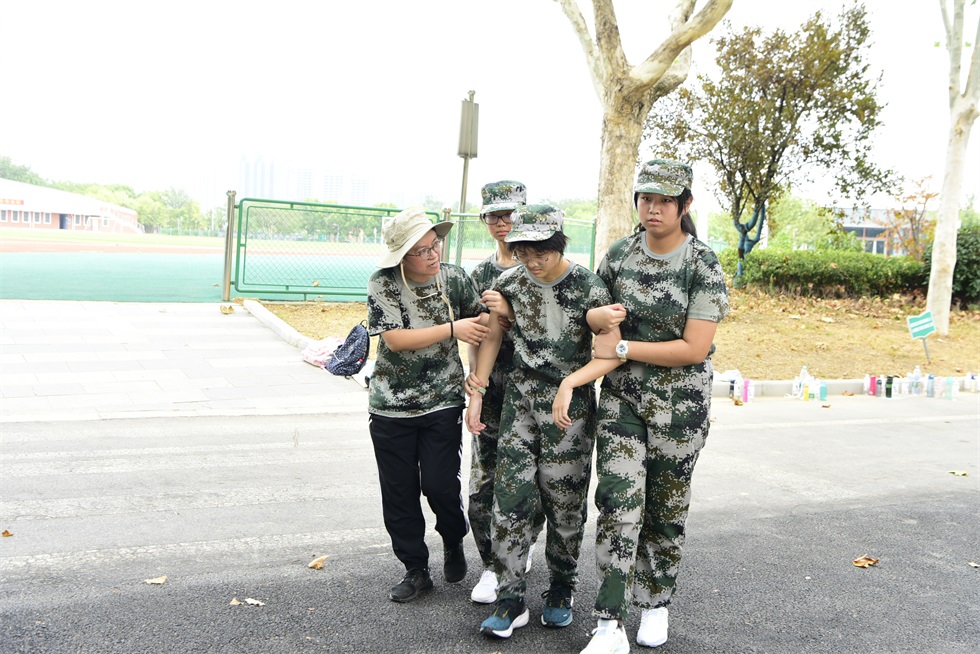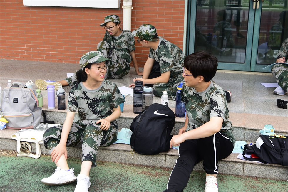 休息了,同学们一下子放松下来,他们大多是坐在地上喝水聊天,也有个别精力旺盛的正在追逐嬉闹。与平时不同的是,多人出行包括上厕所都是一路纵队,整齐排列。