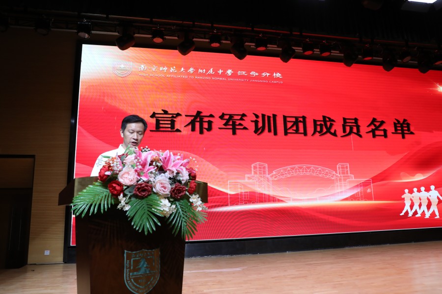 承训部队的教官们迈着整齐划一的步伐进入音乐厅与同学们见面。嘹亮的国歌声后,副校长、国际部校长黄伟老师宣读军训团名单,