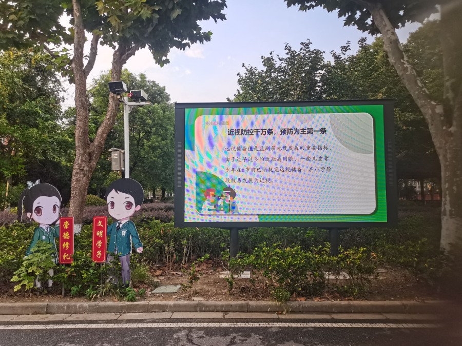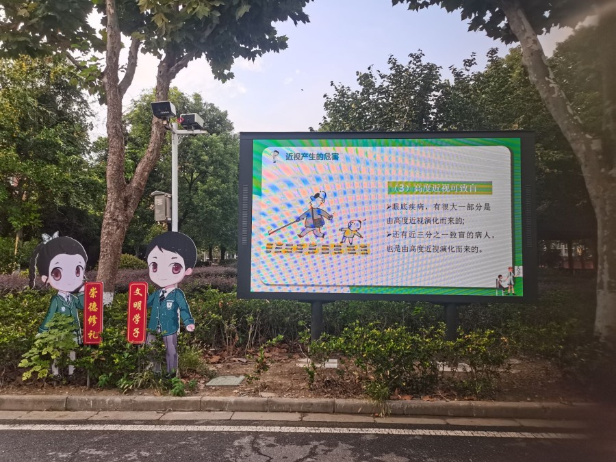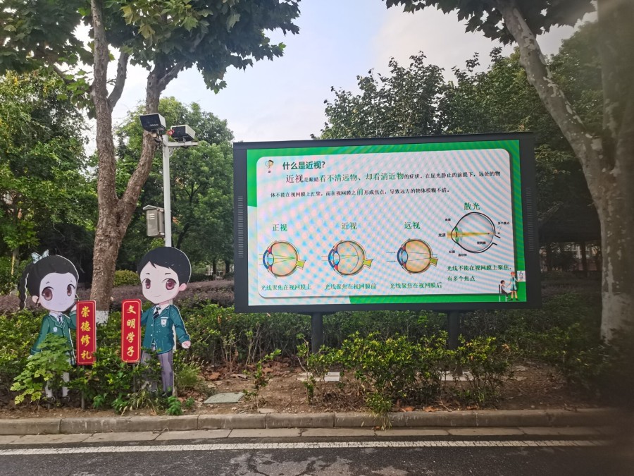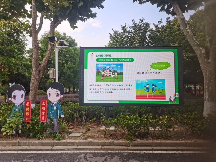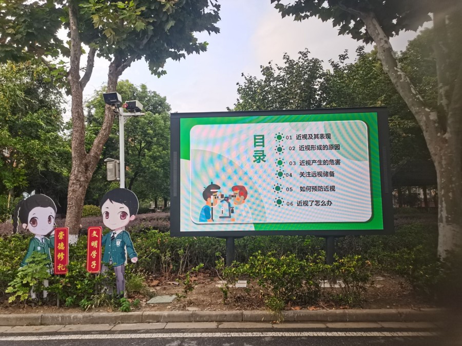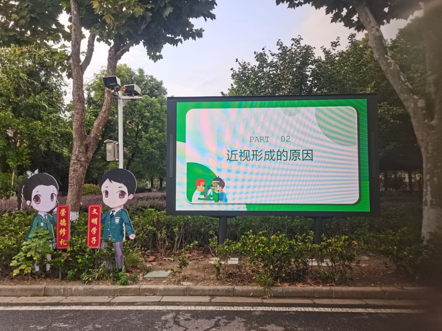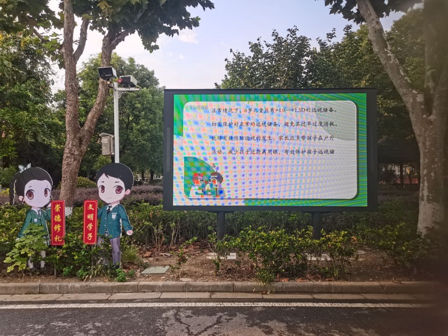 走进校园,教学区 LED 屏正循环播放着 科学用眼小课堂动画短片 —— 如何正确握笔电子产品使用时长建议,生动的画面配上易懂的解说,让路过的师生不自觉放慢脚步;生活区电子显示屏则以图文并茂的形式,每日更新 护眼小贴士,如 每天 2 小时户外活动,有效延缓近视”“眨眼 20 下,缓解用眼疲劳。此外,校门口的宣传展板还特意标注了 远视储备的重要性,提醒家长关注孩子视力发育关键期。随处可见的护眼元素,让 爱眼、护眼的理念悄然融入校园日常。