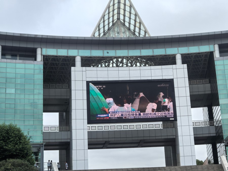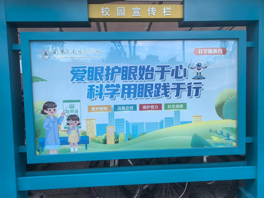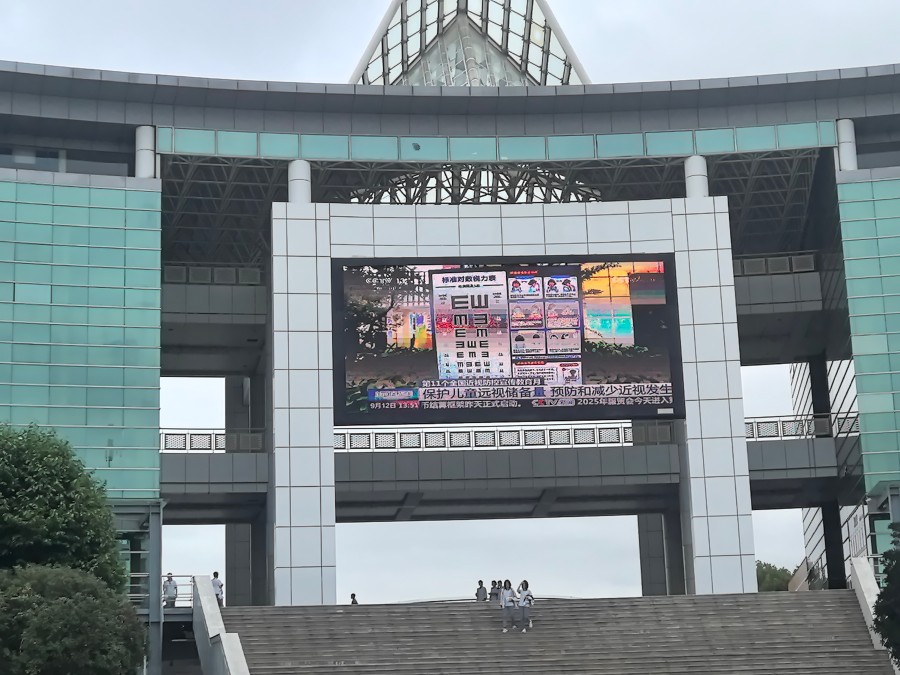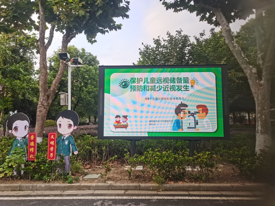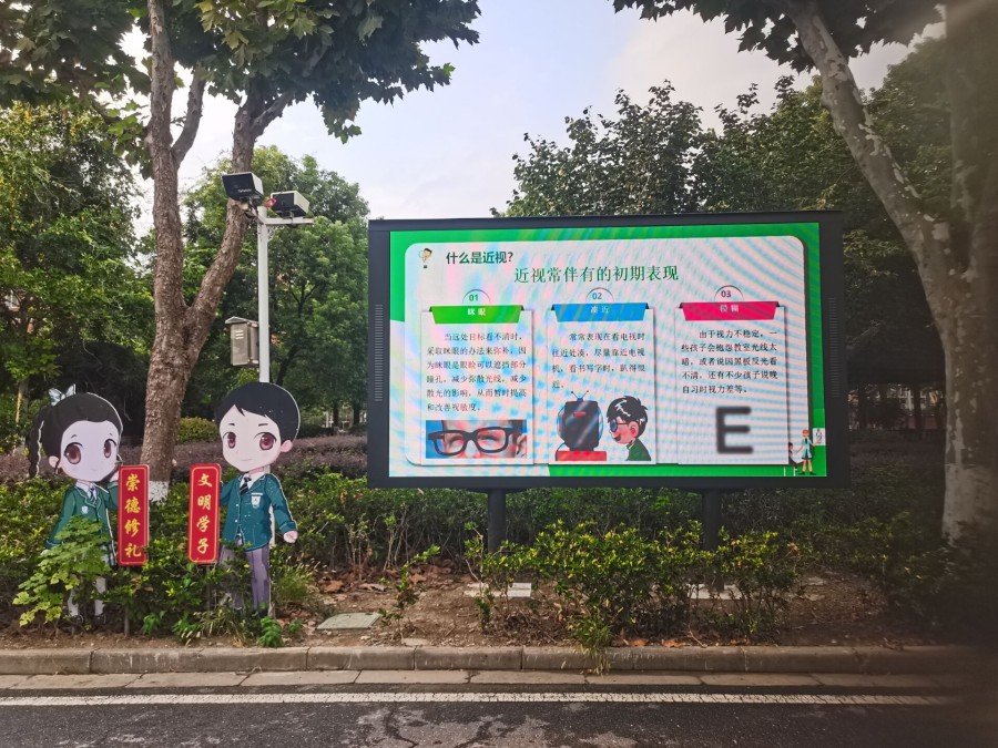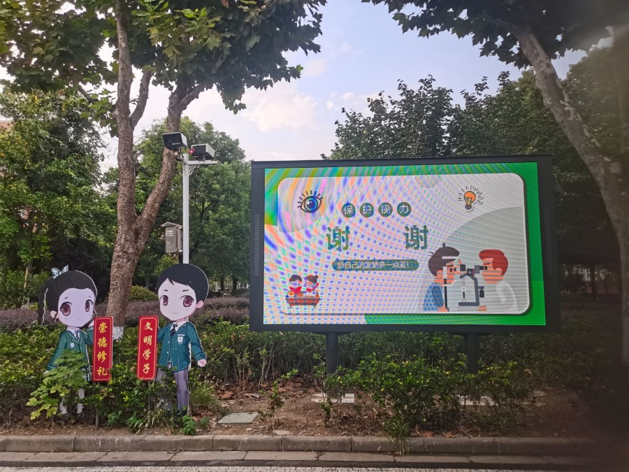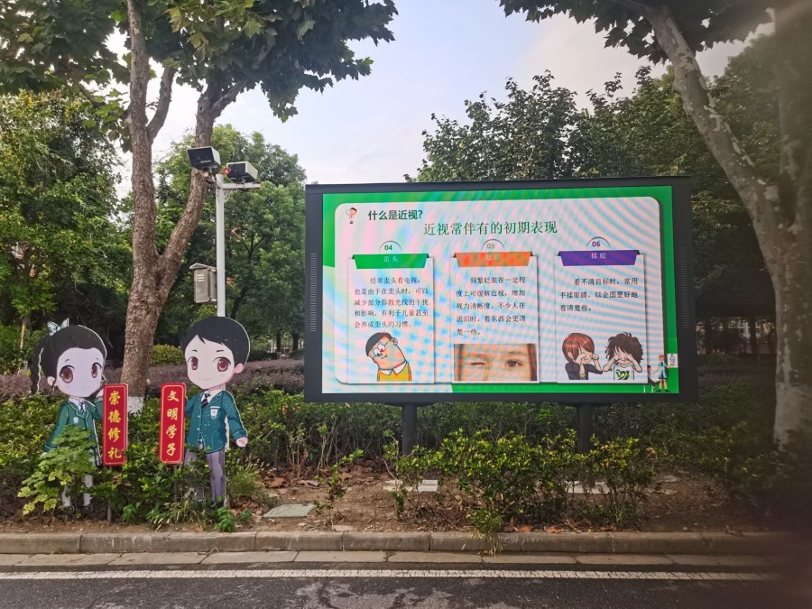走进校园,教学区 LED 屏正循环播放着 科学用眼小课堂动画短片 —— 如何正确握笔电子产品使用时长建议,生动的画面配上易懂的解说,让路过的师生不自觉放慢脚步;生活区电子显示屏则以图文并茂的形式,每日更新 护眼小贴士,如 每天 2 小时户外活动,有效延缓近视”“眨眼 20 下,缓解用眼疲劳。此外,校门口的宣传展板还特意标注了 远视储备的重要性,提醒家长关注孩子视力发育关键期。随处可见的护眼元素,让 爱眼、护眼的理念悄然融入校园日常。