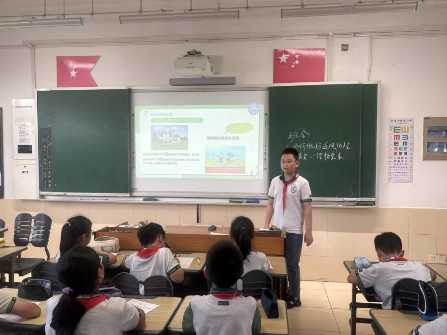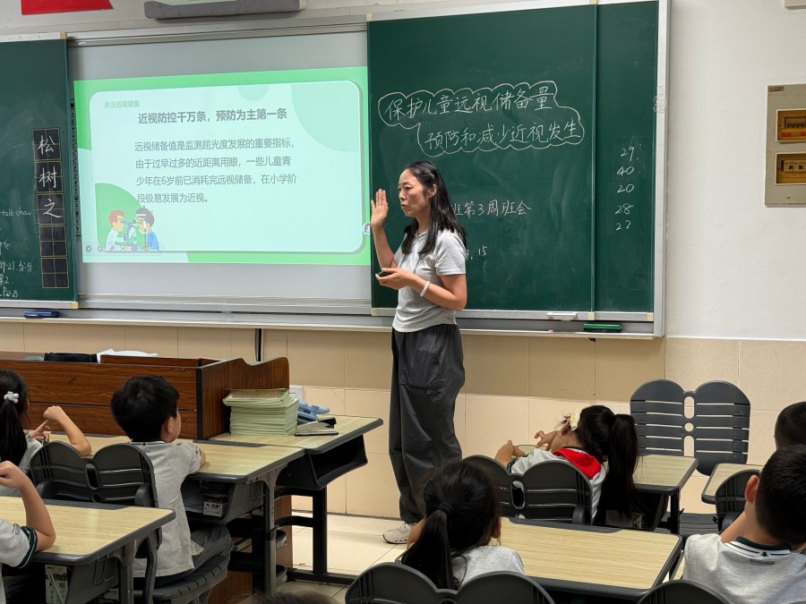 大家知道吗?如果长时间歪头写字,不仅会让脊柱变弯,还会让眼睛受力不均,慢慢变成近视哦!在各班级的近视防控主题班会上,老师们化身 护眼讲师,用孩子们听得懂的语言、贴近生活的案例,系统讲解视力保健知识。有的老师拿出视力表教具,现场邀请同学演示 正确测视力的姿势,纠正 眯眼、歪头等错误做法;有的则结合 课间十分钟该不该出教室的讨论,引导学生明白 远眺放松对眼睛的重要性。课堂上,同学们还踊跃分享自己的 护眼小妙招”——“我每天做完作业都会去阳台看 5 分钟绿植”“我妈妈不让我睡前看平板,热烈的互动让护眼意识深深扎根在每一位孩子心中。