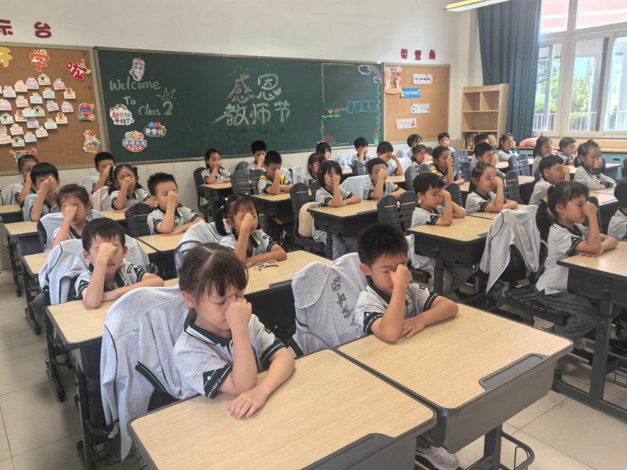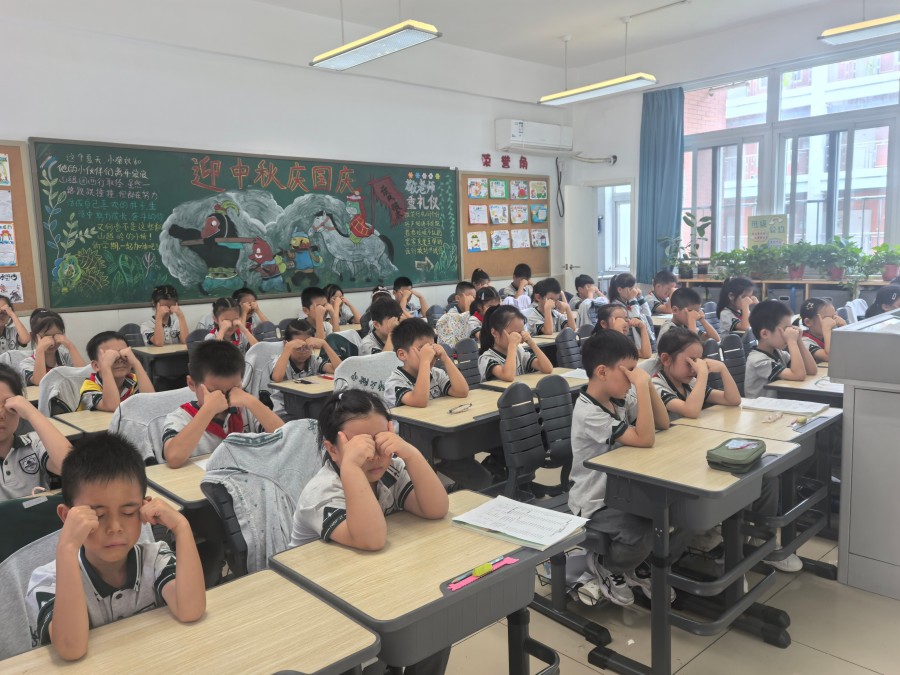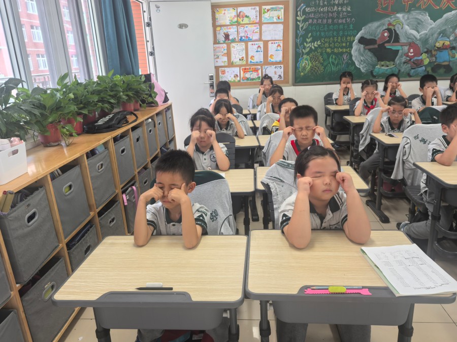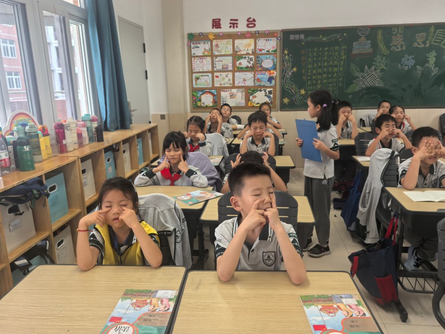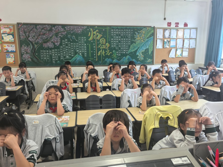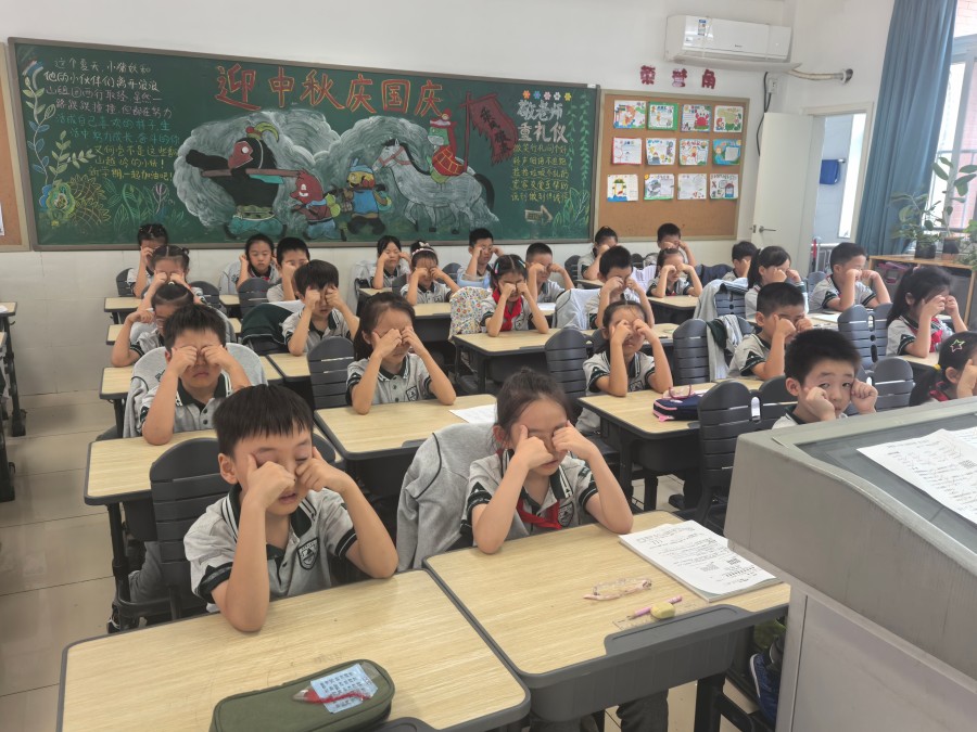 第一节,揉天应穴 —— 按揉时力度要适中,不要太轻也不要太重哦!每天上午第二节课后、下午第一节课后,校园里都会准时响起眼保健操音乐。为确保眼保健操 做对、做规范,学校不仅安排行政值班领导巡查各班级,还让任课教师在教室现场指导:发现学生 穴位找不准,老师会弯腰示范;看到 动作敷衍,会轻声提醒 认真做才能让眼睛休息好。久而久之,认真做眼操成了孩子们的自觉行动,每一个规范的动作,都是对眼睛最温柔的呵护。