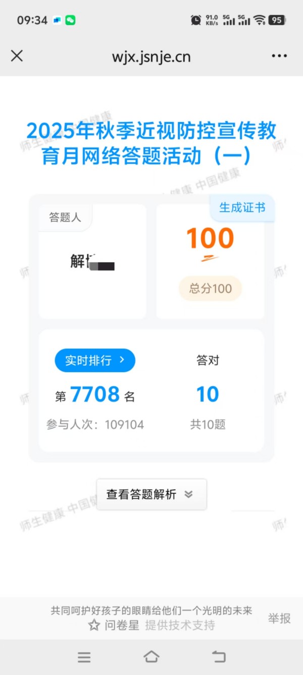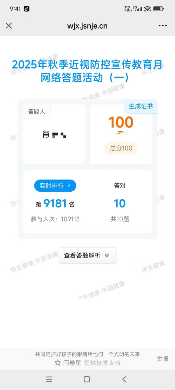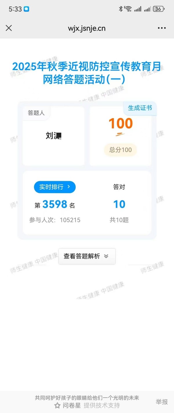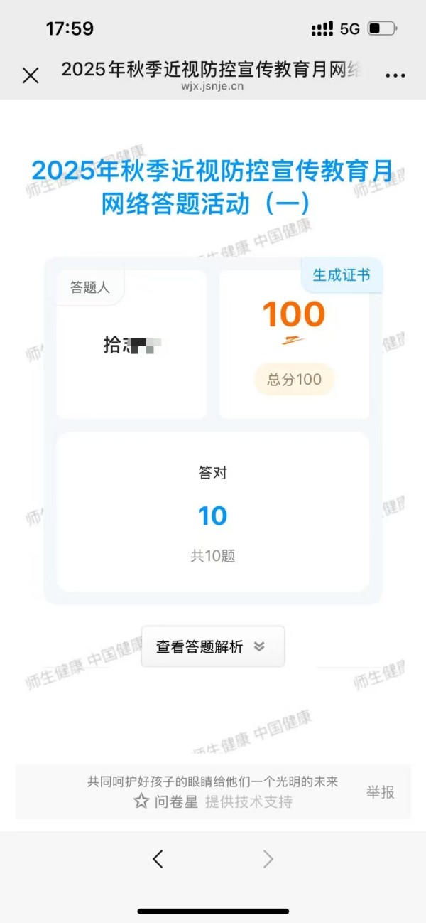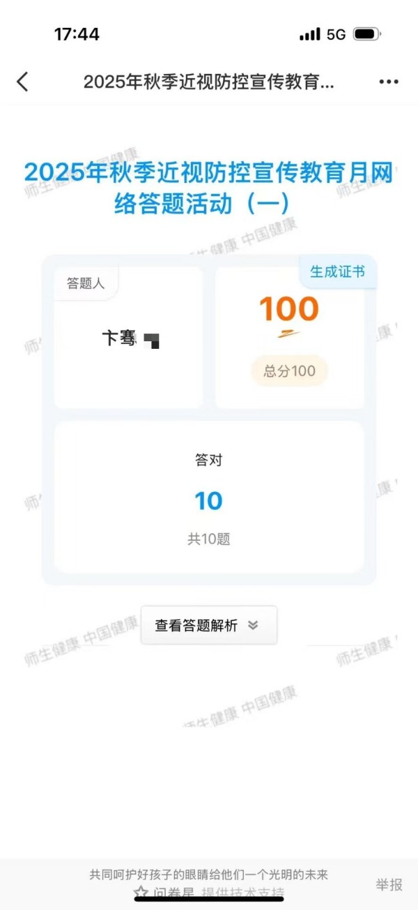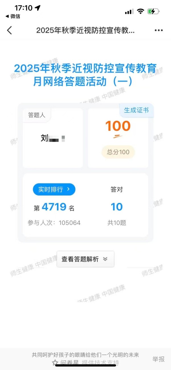 各位家长,市中小学卫生保健所发起了近视防控知识网络答题活动,建议大家和孩子一起参与,既能学习知识,还能赢取护眼小礼品哦!活动期间,学校通过班级微信群、QQ 群,及时推送由市疾控中心、校医室整理的权威护眼资源 —— 包括 家庭护眼指南”“儿童视力发育时间表,以及各类线上答题、科普直播链接。不少家长在群里分享答题截图,留言 和孩子一起答题才发现,原来很多护眼误区我们都踩过,以后要跟孩子一起养成好习惯。家校同心、同向、同行,真正形成了 校园护视力、家庭助健康的协同合力。