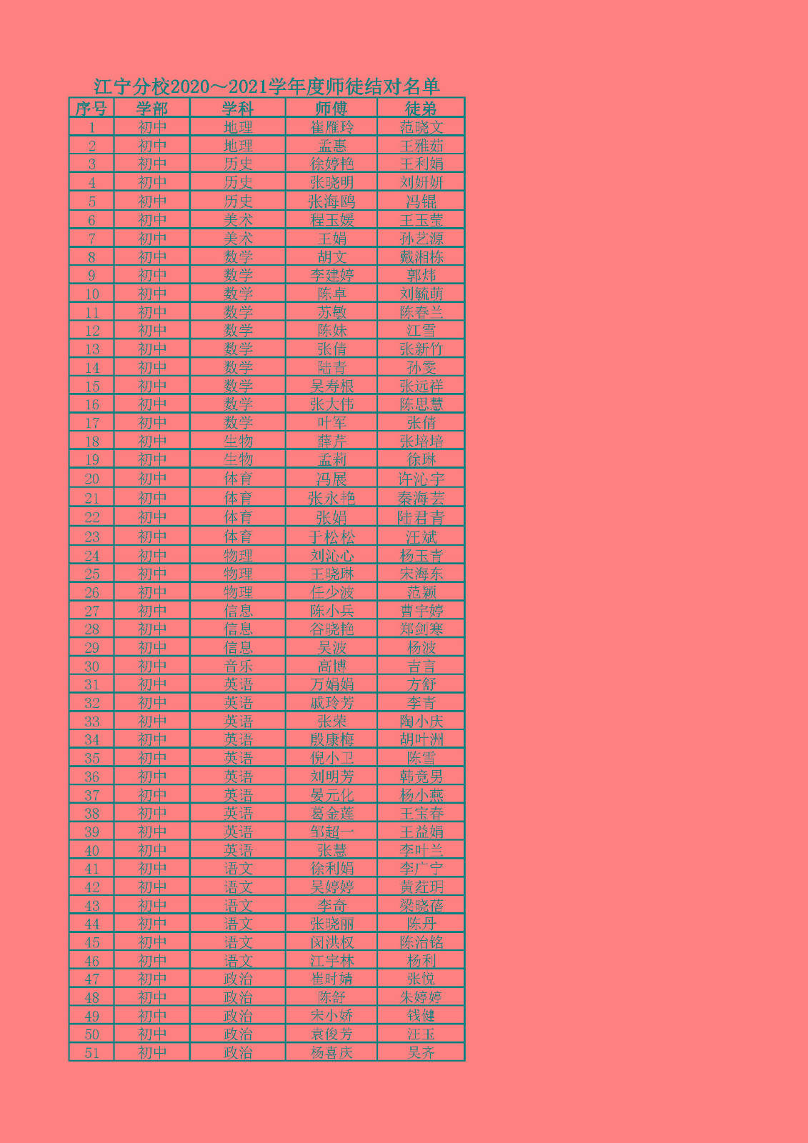 江宁分校2020~2021学年度师徒结对名单