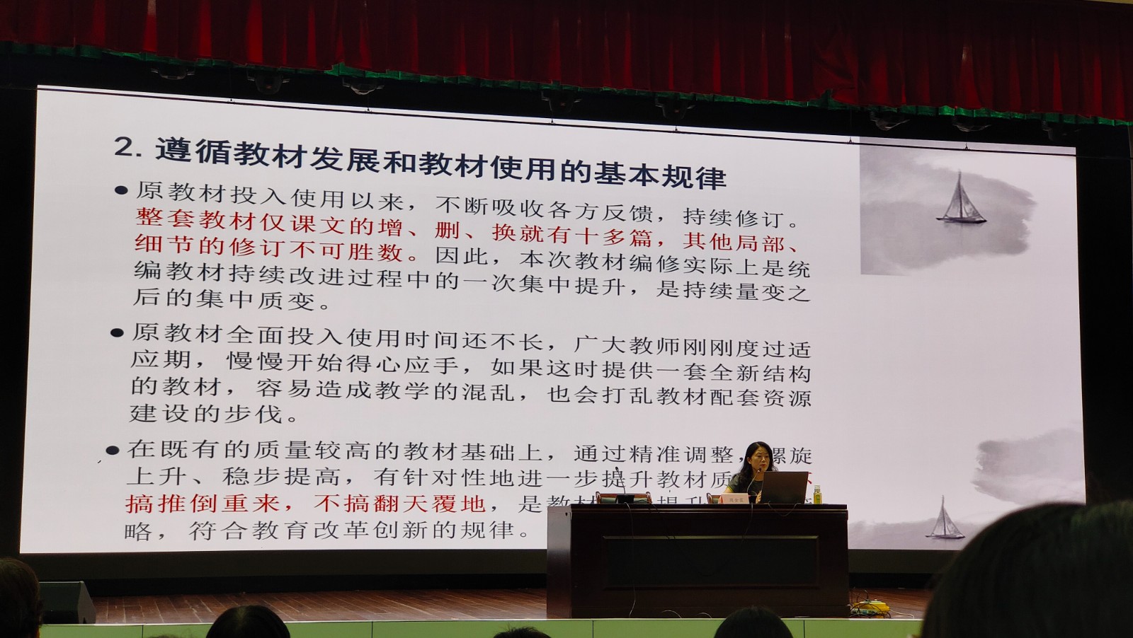 上午 9:00,培训正式启动。南京市学科带头人、江宁区教研室周金霞老师以《七年级教材介绍及问题答疑》为题作主旨报告。她从教材整体框架、新增内容特点、教学常见问题解决方案等方面进行全面讲解,有效解决了教师在教材使用中的困惑。