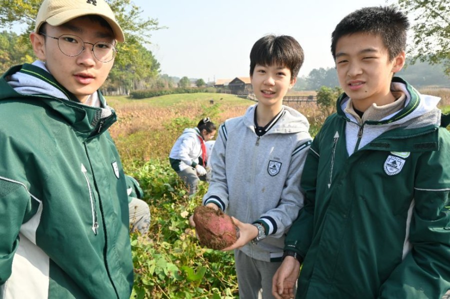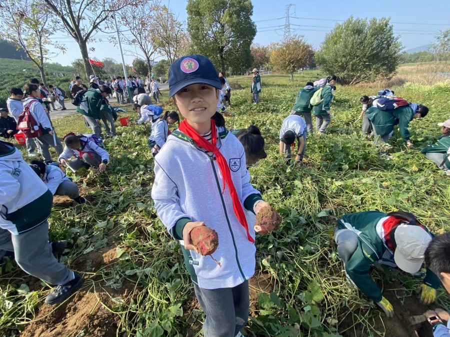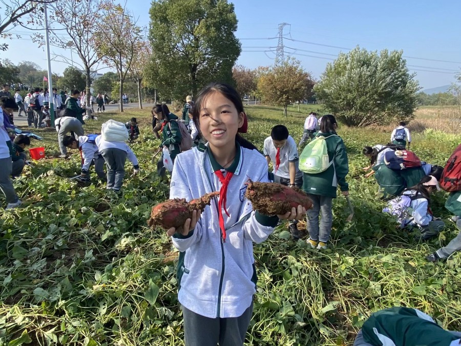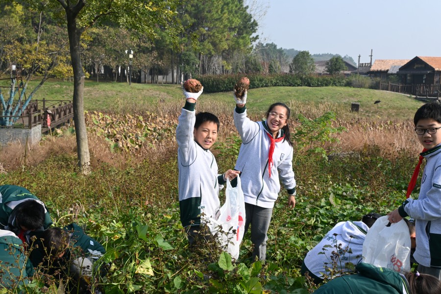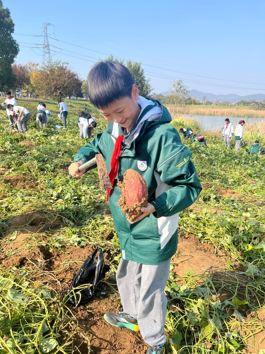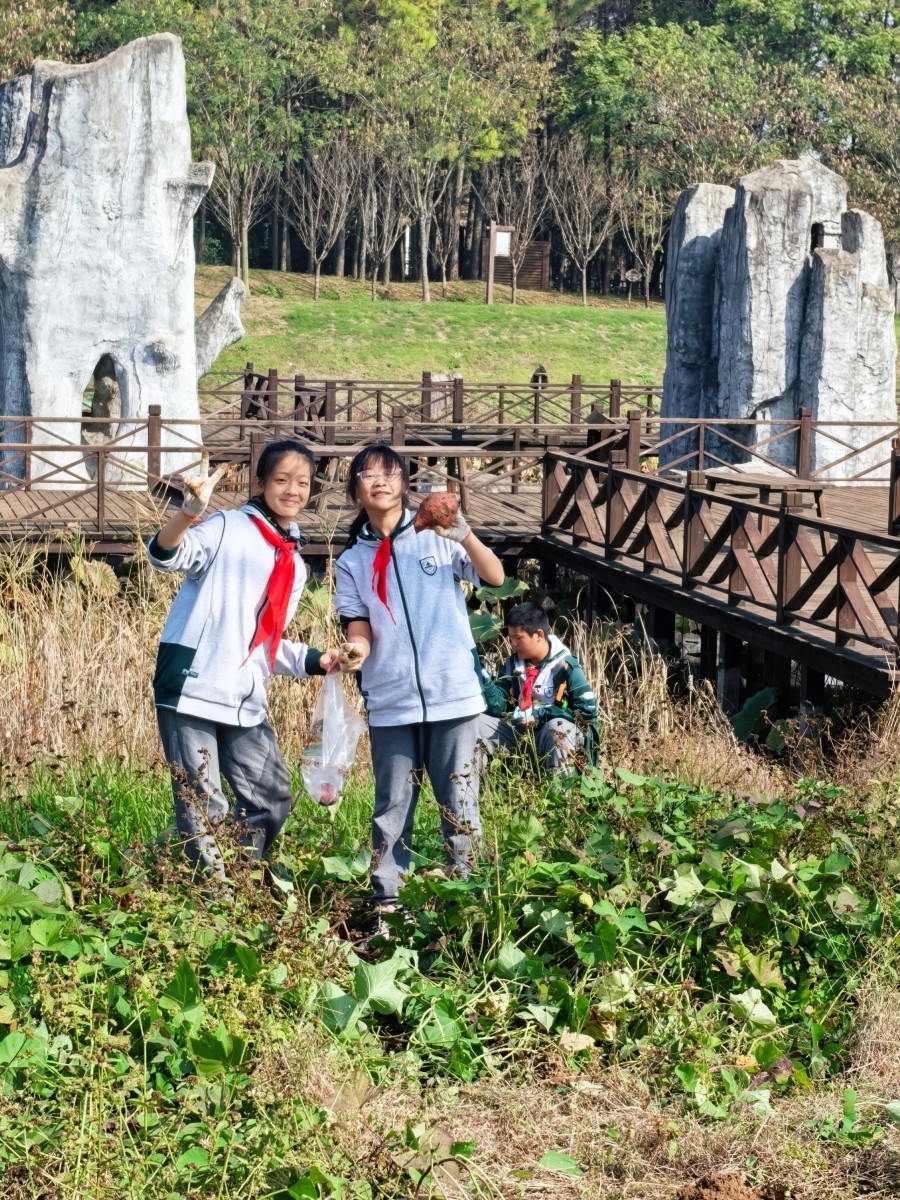 抵达基地后,生动的课程导入与细致的安全宣讲为活动拉开序幕。同学们分为农耕实践组与生态体验组,轮换参与各项任务,其中挖红薯环节成为全场最受欢迎的焦点,让大家直呼“意犹未尽”。红薯地里,同学们循着藤蔓的走向仔细探寻,小心翼翼拨开叶片,找准根系位置后,握紧锄头轻轻刨开表层泥土。起初,不少同学用力过猛不小心碰伤薯块,或是挖了半天仍不见红薯踪影,但大家很快总结经验——顺着藤蔓根部慢慢松动土壤,感受泥土下的硬物轮廓,再顺着边缘逐步深挖。当一个个圆滚滚、红扑扑的红薯带着湿润的泥土被完整挖出时,田间瞬间响起阵阵欢呼。有的同学挖到了“双胞胎”红薯,有的收获了沉甸甸的“红薯王”,大家捧着自己的劳动成果,脸上洋溢着满满的成就感,泥土沾满双手也毫不在意,尽情享受着探索与收获的快乐,田间地头充满了欢声笑语。