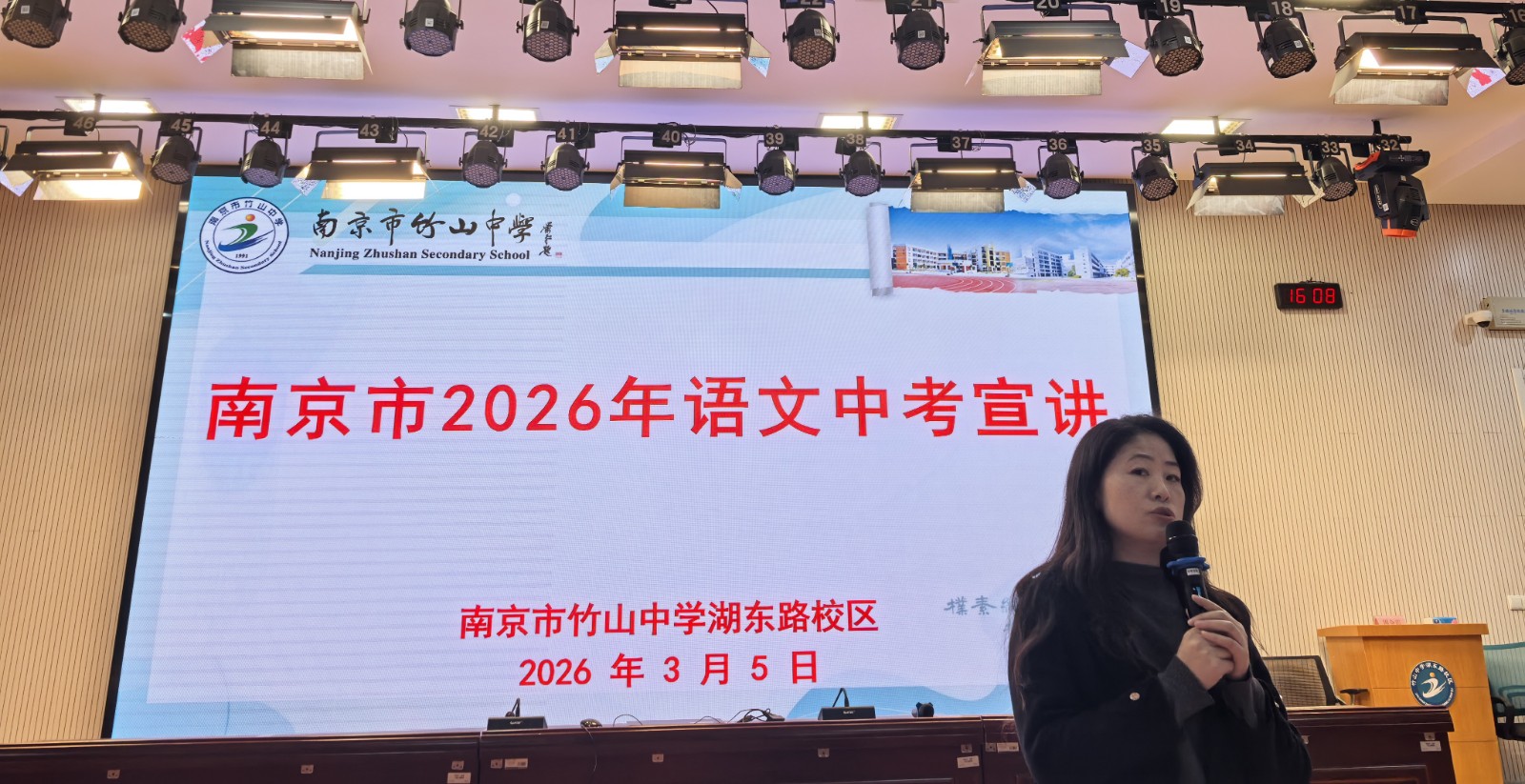 为精准把握 2026年南京市中考语文复习方向,优化复习备考策略,提升教学质效,3月5日下午,南京市中考语文宣讲活动在竹山中学湖东路校区举行。本次活动由市初中教研员袁媛老师主持,我校初三语文组全体教师参会学习。
