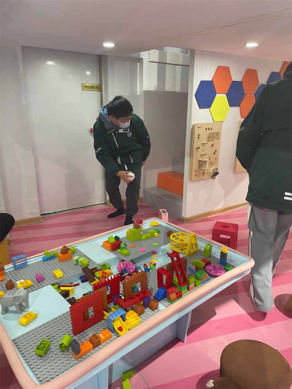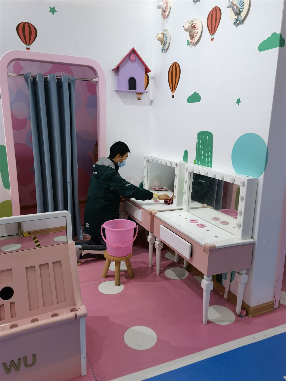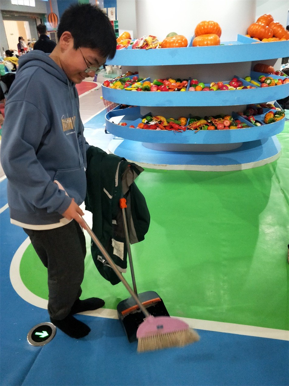 亲子乐园管理员的指导使我们干起活来得心应手。捡拾被扔出池外的海洋球,擦洗橱柜与游乐设施,收纳玩具以及垃圾,在过程中,遇到了许多麻烦,像之前刚扔进去的海洋球,又有一些从另一个地方飞旋而出,人类幼崽推着车到处乱撞,整理好的衣服又扔到了地上……我们跟在后面不停整理,可整理完了又弄乱。我们思考有没有更好的办法。于是我们通过和小朋友交流、不停的“赞美”他们,让他们主动保持场馆的整洁,成效还非常显著。你看,我们学会了与不同年龄段的人交流。
