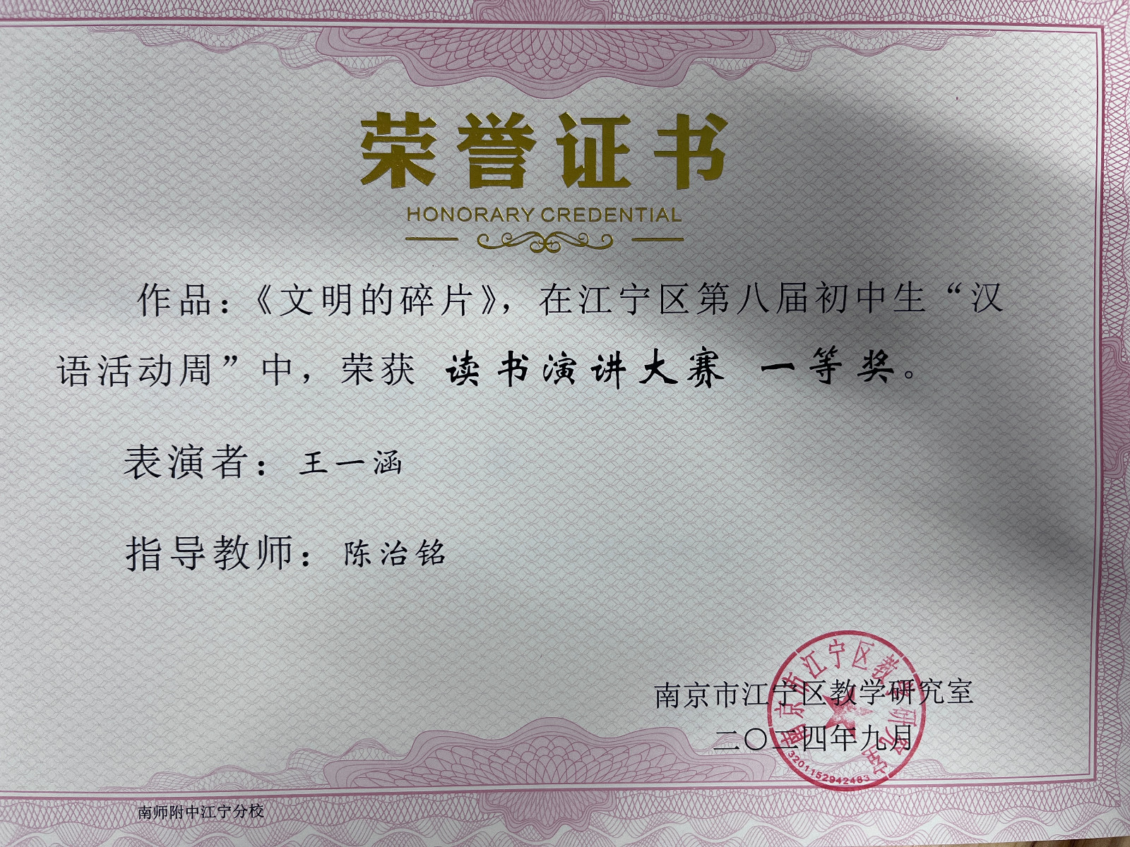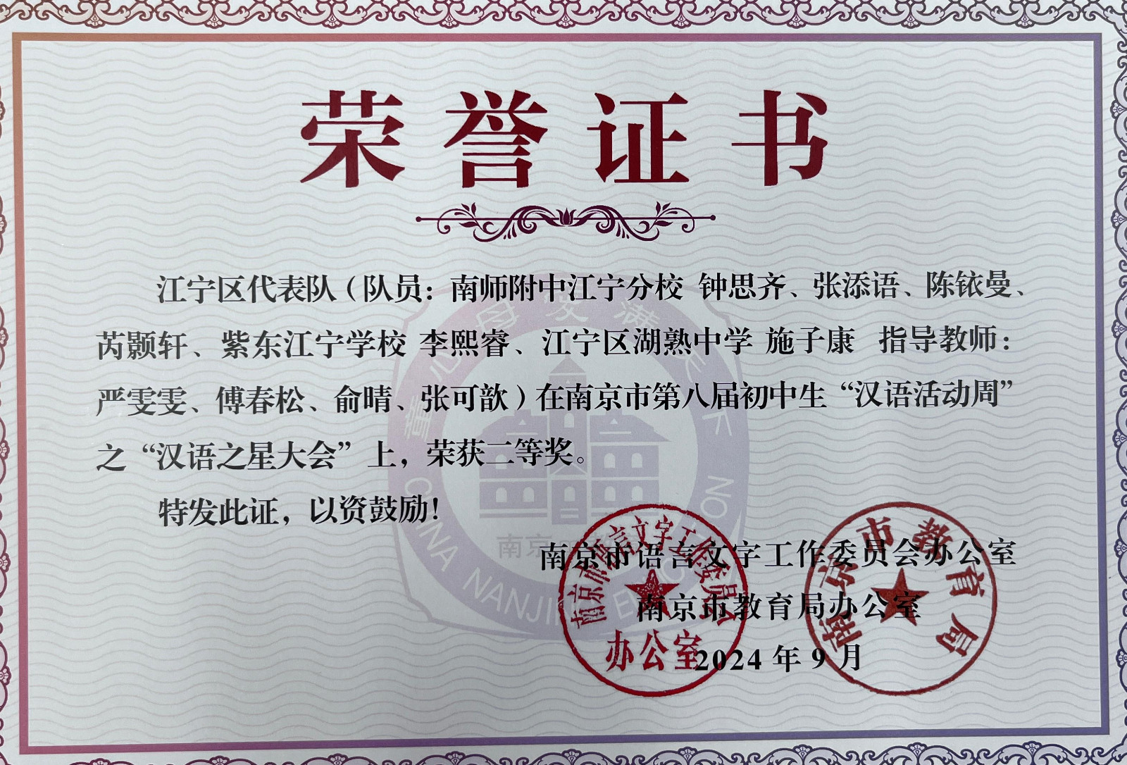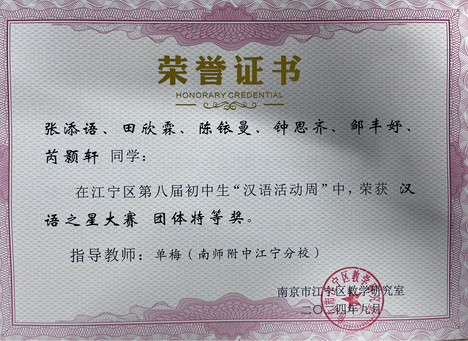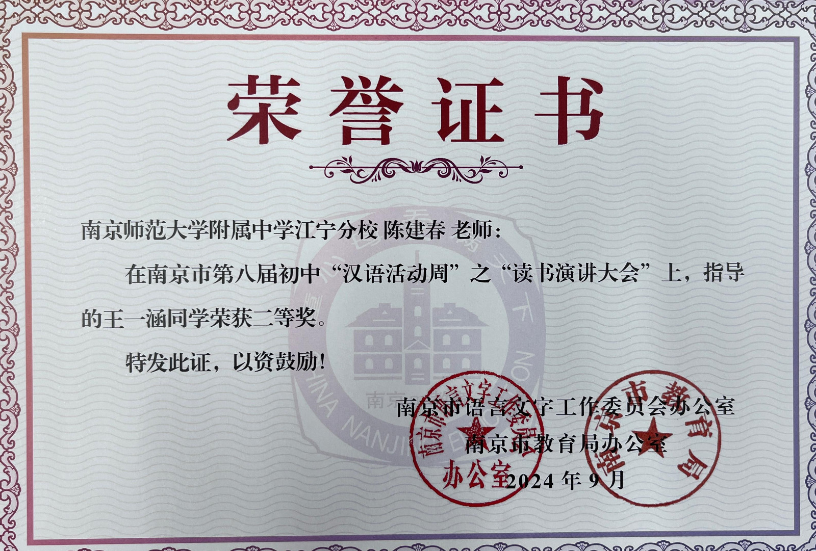 在江宁区第八届、南京市第八届初中生“汉语活动周”系列活动中,南师附中江宁分校代表队喜获多个奖项。向奖项的师生表示热烈祝贺,向参赛学生和辛苦付出的辅导老师表示衷心感谢。在9月12日举行的江宁区语文教研活动上,教研员周金霞老师还颁发了部分老师的获奖证书,祝贺获奖老师。