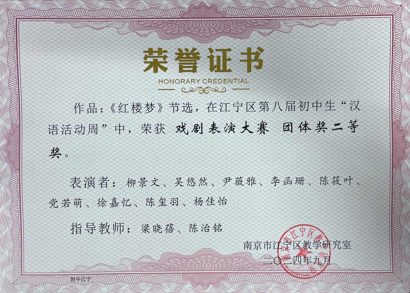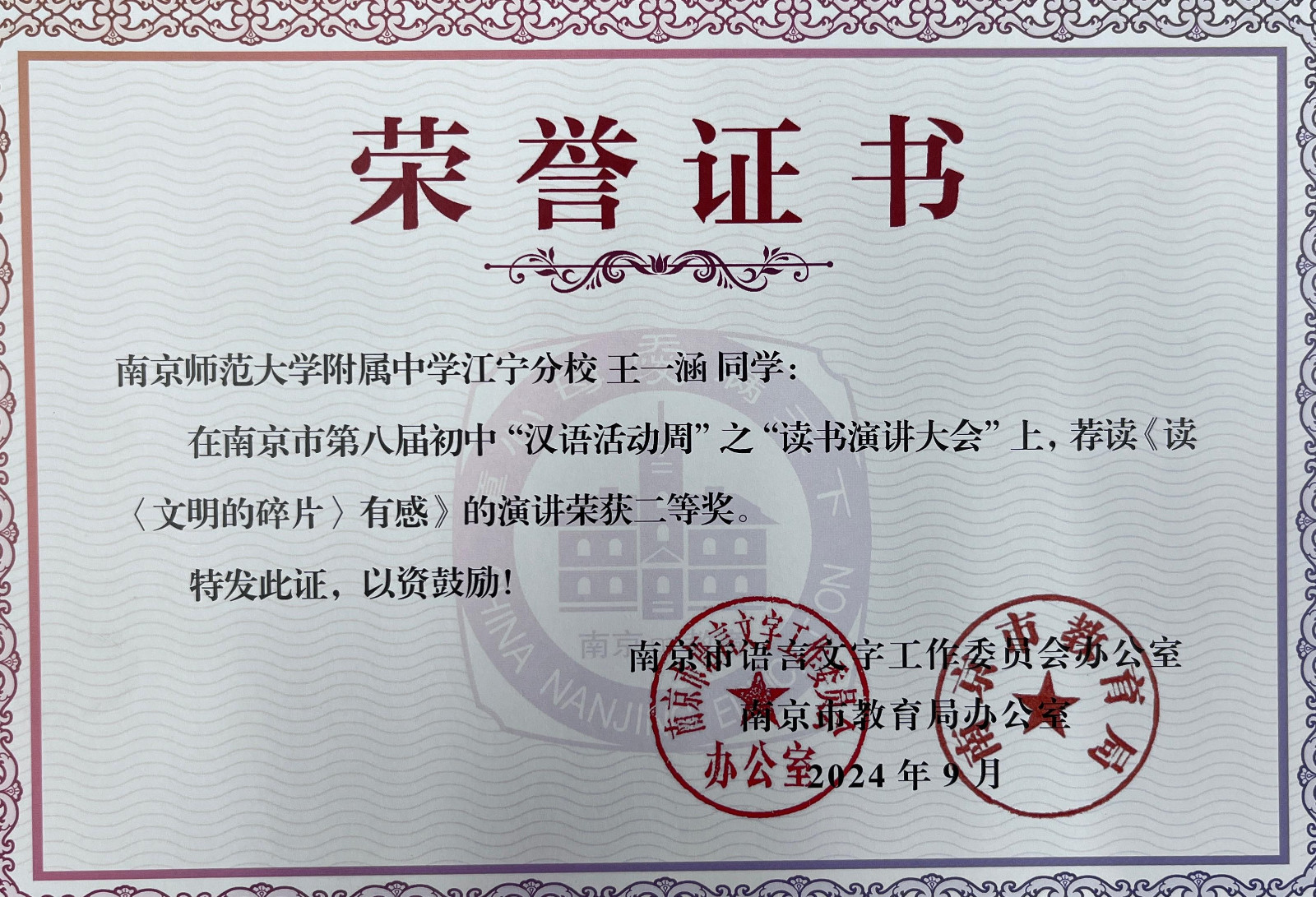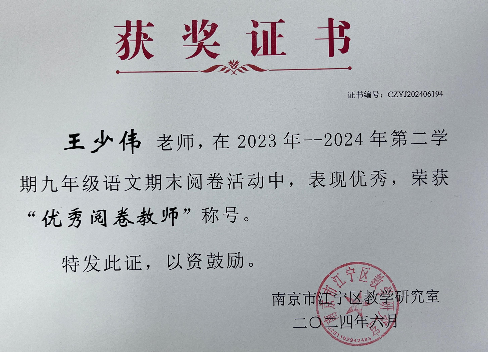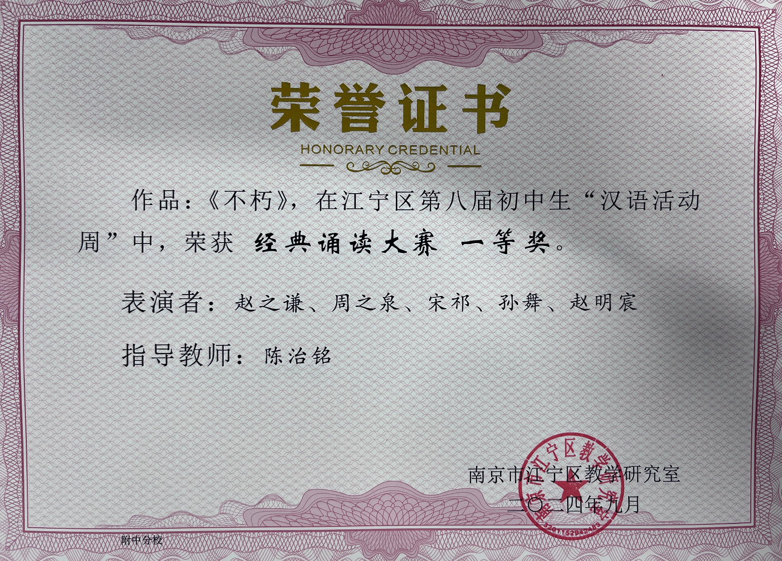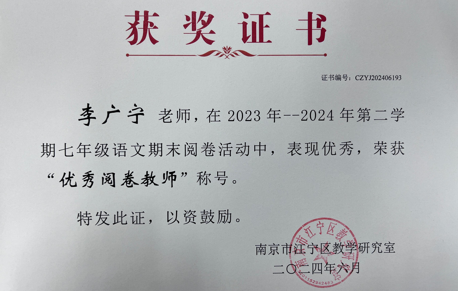 在江宁区第八届、南京市第八届初中生“汉语活动周”系列活动中,南师附中江宁分校代表队喜获多个奖项。向奖项的师生表示热烈祝贺,向参赛学生和辛苦付出的辅导老师表示衷心感谢。在9月12日举行的江宁区语文教研活动上,教研员周金霞老师还颁发了部分老师的获奖证书,祝贺获奖老师。