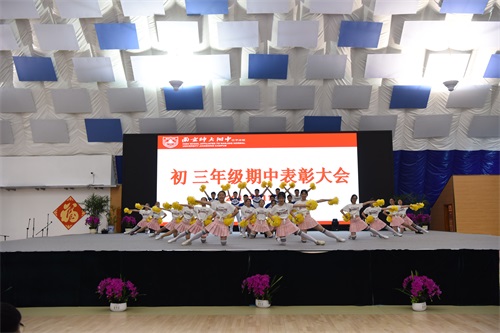 11月22日,初三年级在学校气膜体育馆隆重举行期中总结表彰大会。首先是刚刚获得南京市二等奖的啦啦操校队进行表演。
