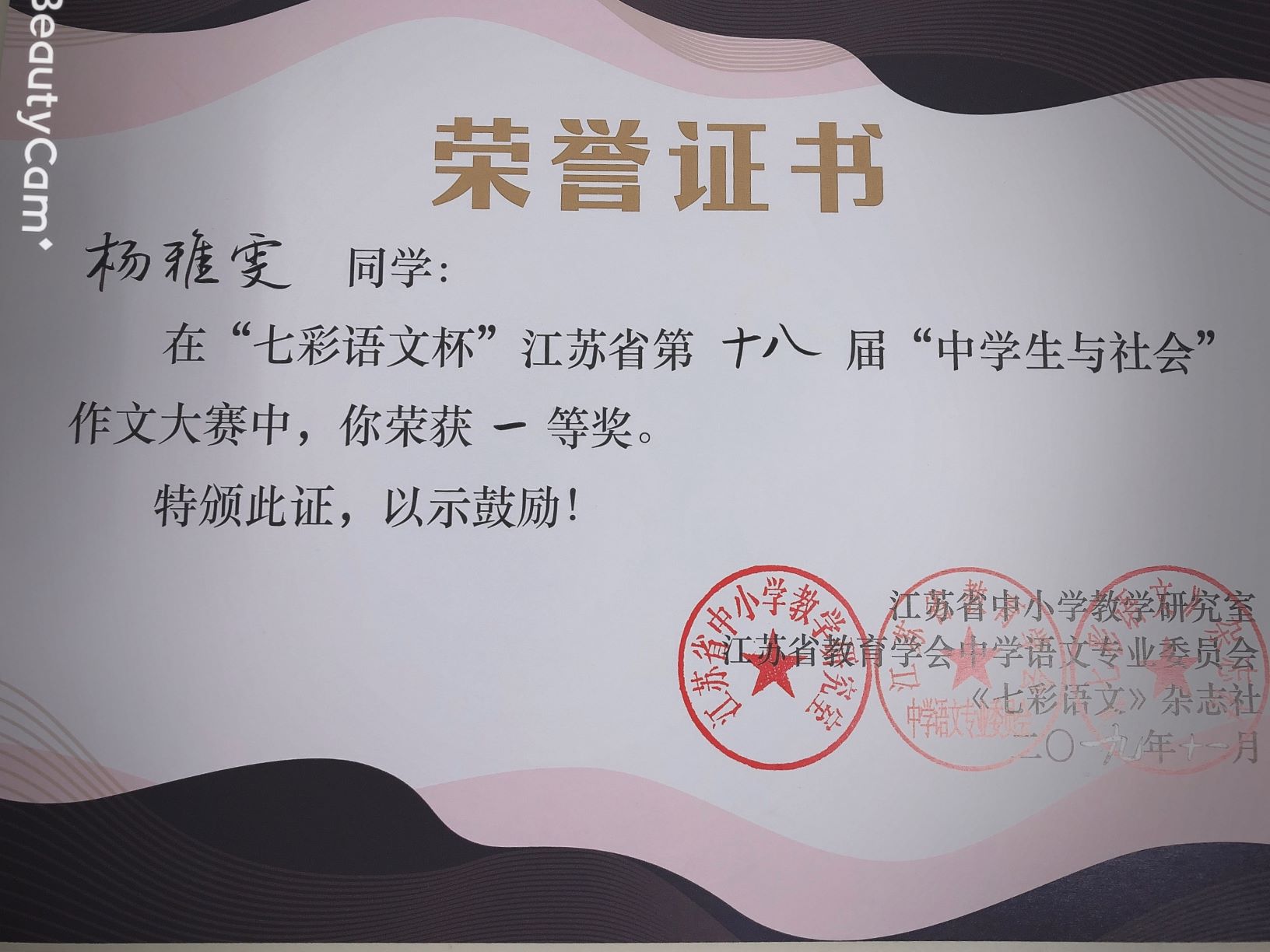 2019年11月23日下午,第十八届江苏省“中学生与社会”作文大赛决赛在金陵中学河西分校举行,我校初中部初三(7)班耿迪、初三(21)班杨雅雯两位同学喜获省一等奖。其余五位同学获得省二等奖。