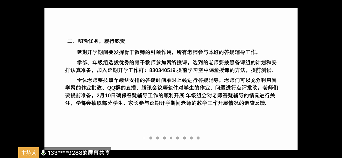 2月7日,初中英语组全体成员开展了线上第一次教研活动。各备课组分别对近期网络教学开展情况、作业检查情况、早读情况等有效操作方式进行了汇报交流。大家围绕如何提高线上教学效率、多种网络授课方式比较等展开了热烈的讨论。“停课不停学,停课不停研”。