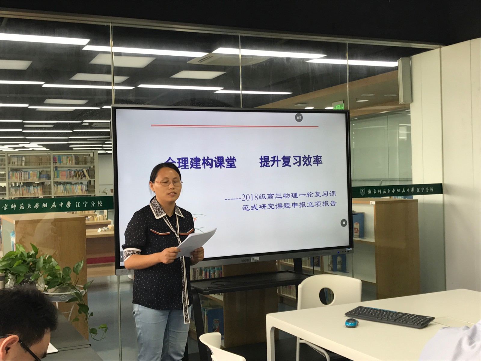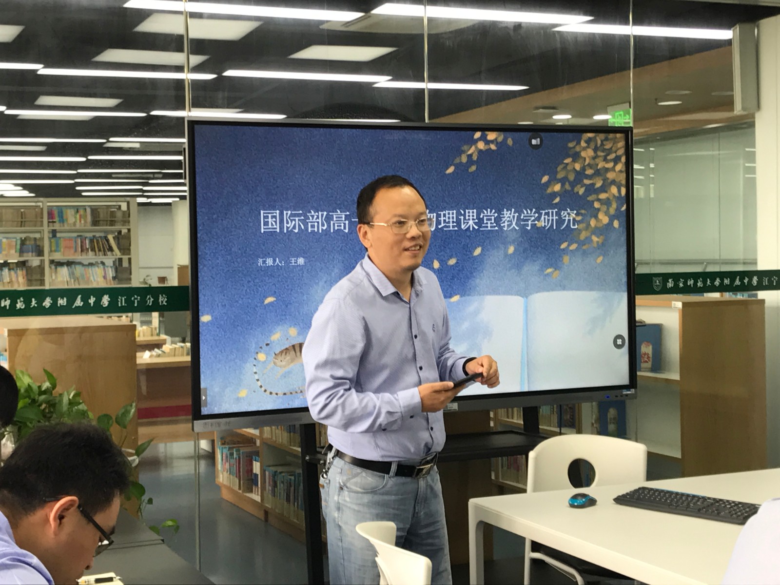各组长根据本年级的特点,基于对学生成长得到最优发展的思考,课题主要为“基于创新实验器材的综合实践活动”、“基于适合学生个性成长的分层练习设计”、“基于问题的课堂教学片段设计”、“问题教学法在高一物理课程中的设计与评价”、“在旧教材下实施新课程的课堂实践创新探索”、“高三一轮复习课范式研究”、“国际部高一通识物理课堂教学研究”,阐述了正在做和将要做以及预期的效果。
