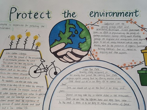 本届外语节,为了响应低碳,普及环保理念,以及通过新颖的宣传形式弘扬我校的绿色文化,进行思想意识教育和艺术文化教育,引导学生成为绿色使者,丰富学生的英语-艺术生活,我校初二英语组开展了一届“绿色—环保”英语海报设计比赛。