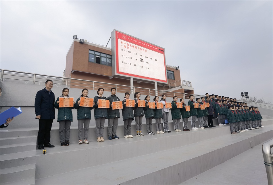 在前两个环节“春天的遐想”和“相约在春天”之后的是第三个环节“春天的行动”,主持人介绍了校园内初一初二的同学们积极开展体育运动,初三同学积极备战体育中考的情形,初中部还表彰了班级图书角评选中优秀的班级,由初中部校长石爱平老师和教学服务中心主任沈保兵老师为获奖班级颁奖。