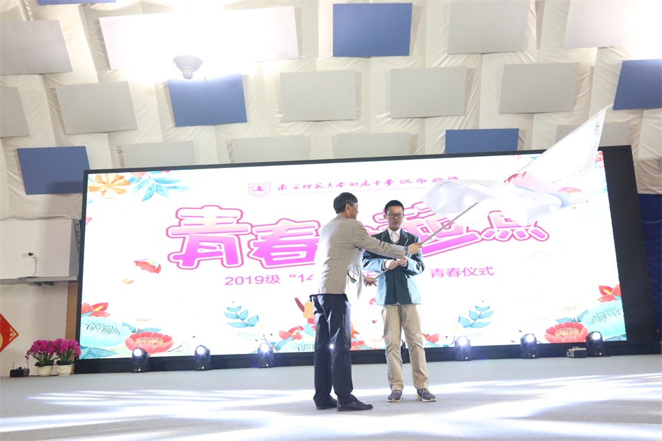 青春仪式的最后,是张士民校长为初二年级即将举行的14公里远足活动授旗。从此,我们告别童年,站上青春的起点!星辰大海是我们的向往,我们乘长风破万里浪,不负青春、勇往直前!