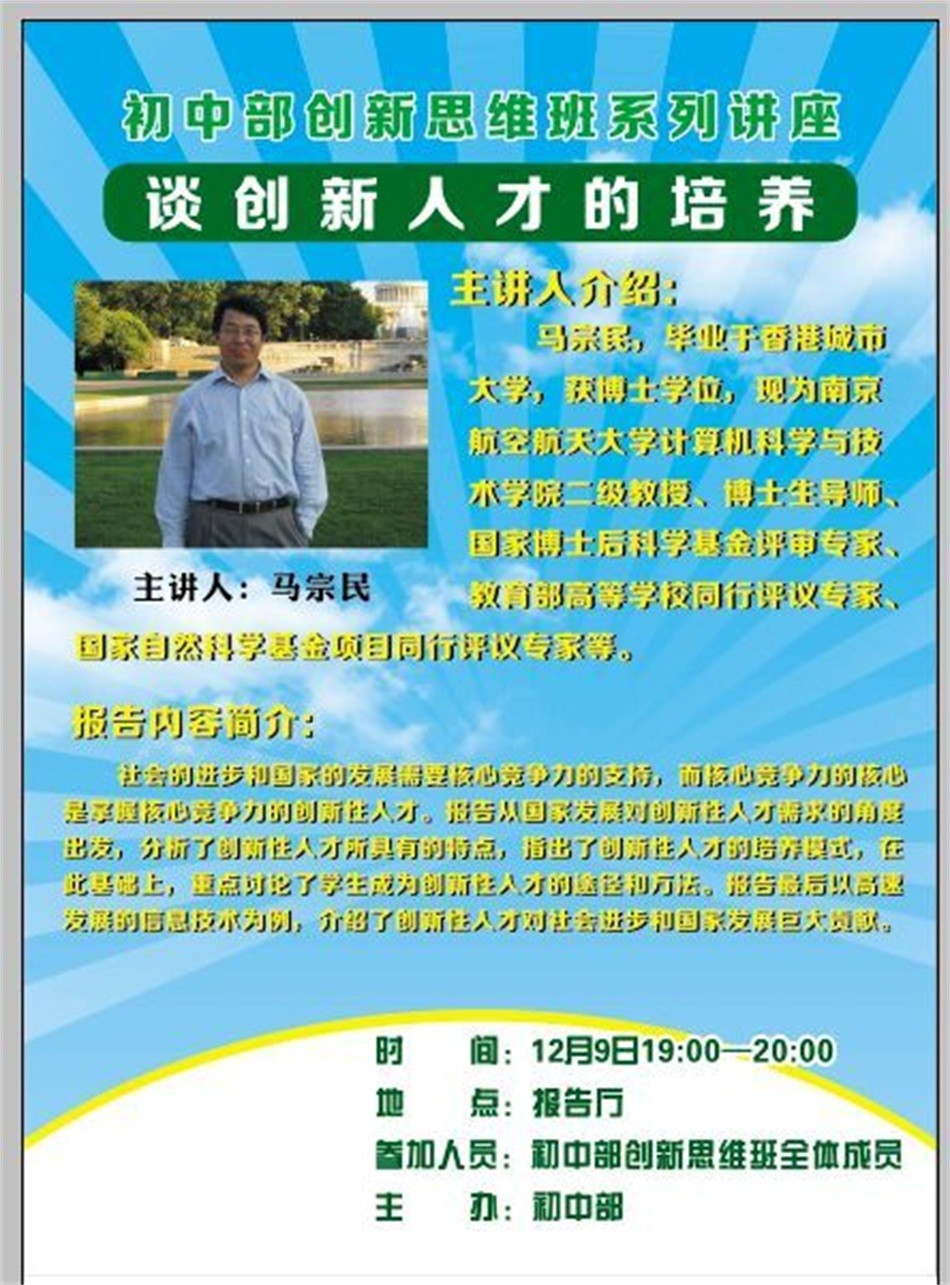 (2)“分校讲坛”课程:学校每学期邀请科学家、大学教授、作家、企业家、新闻媒体人、优秀校友……来校为学生开设讲座。