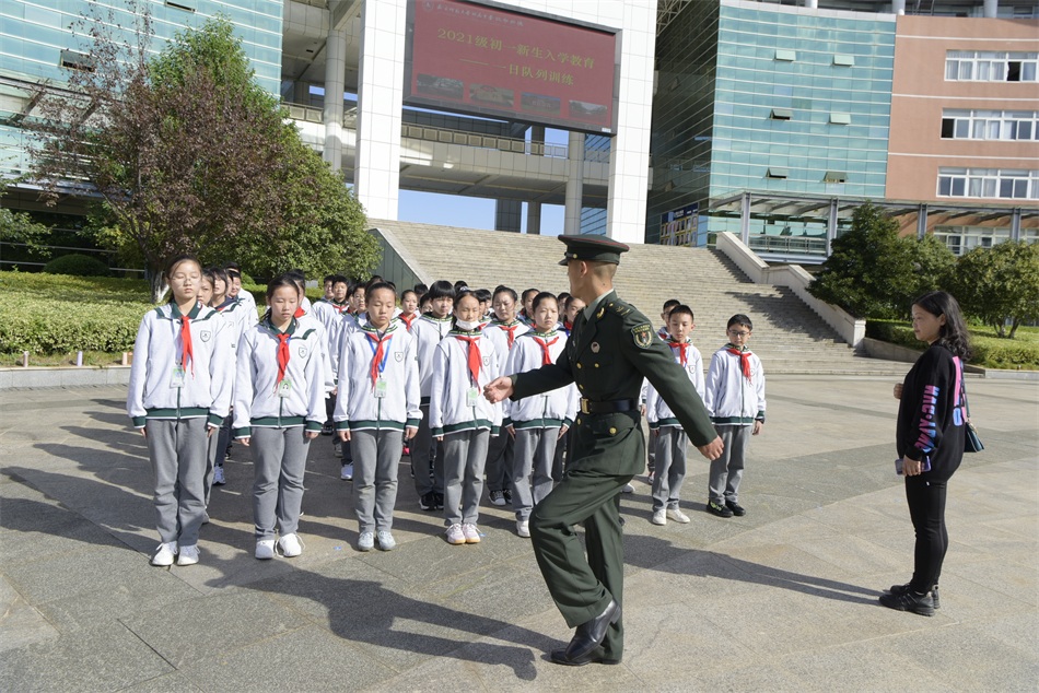 初一年级全体学生齐聚我校圆形广场,进行新生入学教育指导的第六次课程——一日队列训练。同学们脚踏着雕有世界地图的地砖,头顶着蔚蓝蓝的天空,可谓是胸怀世界,仰望天空。