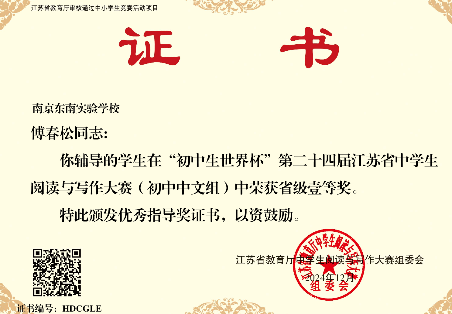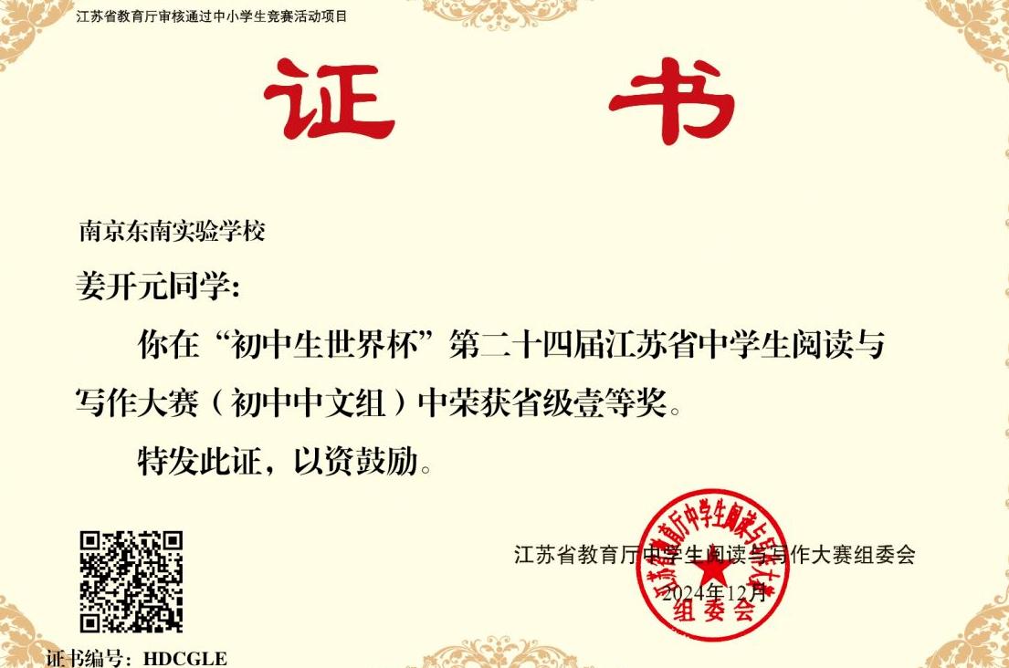 由江苏教育报刊总社(江苏省教育厅教育宣传中心)主办、初中生世界编辑部承办的“初中生世界杯”第二十四届江苏省中学生阅读与写作大赛(初中组)现场决赛于11月30日在南京江北新区浦口外国语学校举行。12月1日下午便传来好消息:我校参赛的两名学生双双获奖。傅春松老师指导的初三(9)班姜开元同学获得省一等奖,颜忠华老师指导的初二(7)徐雅佩同学获得省二等奖;两位老师荣获优秀指导奖。