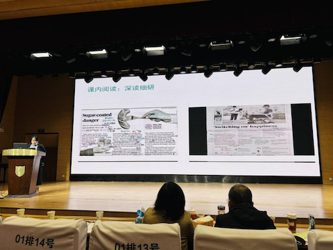 示范课结束后,两场干货满满的讲座接续开讲。我校初中英语教研组长董蓉蓉老师以 “课内外一体化阅读实践” 为主题,针对学生课外阅读量不足、课内外阅读脱节等教学痛点,分享了学校构建的 “教研引领、双轨并行、衔接贯通、活动赋能” 一体化阅读体系。通过目标、内容、方法、评价四维融合的实践路径,实现课内深度与课外广度的有机衔接,为在场教师提供了可落地、可复制的教学方案。