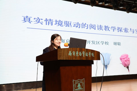开发区学校的谢聪老师则以 “真实情境驱动的阅读教学” 为题,深入解读真实情境的内涵与创设原则。她结合七、八年级课文案例,详细展示如何通过任务、问题、角色三类情境设计,激发学生阅读动机,引导文本解构与内化运用,推动知识迁移创新,为阅读教学注入鲜活活力。