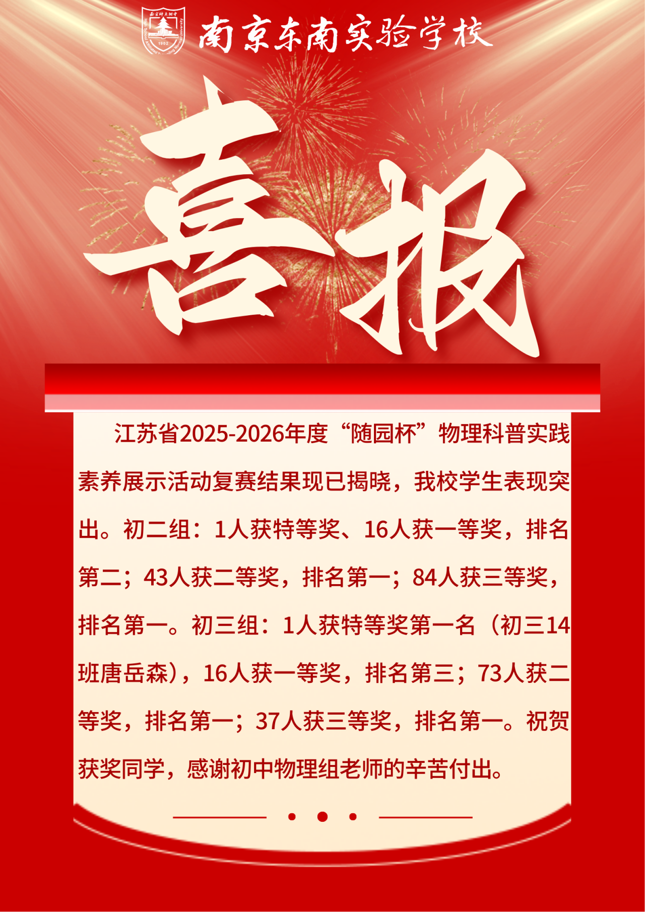 江苏省2025--2026年度“随园杯”物理科普实践素养展示活动复赛结果目前揭晓,我校学生表现突出. 初三组1人获特等奖第一名(初三14班唐岳森),16人获一等奖,排名第三;73人获二等奖,排名第一;37人获三等奖,排名第一。 初二组1人获特等奖、16人获一等奖,排名第二;43人获二喜报等奖,排名第一;84人获三等奖,排名第一。