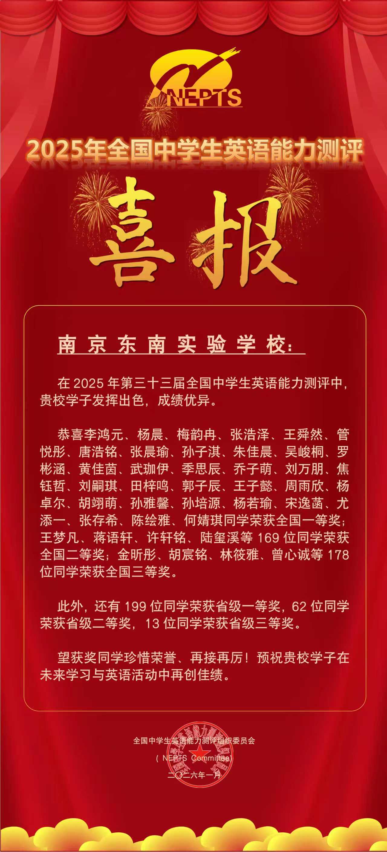 在2025 年第三十三届全国中学生英语能力测评(NEPTS)中,我校初中部学子凭借扎实的语言功底、出色的综合素养与沉稳的赛场表现,在全国及省级赛事中脱颖而出,斩获多项重磅荣誉,续写学校英语学科高质量发展新篇章!