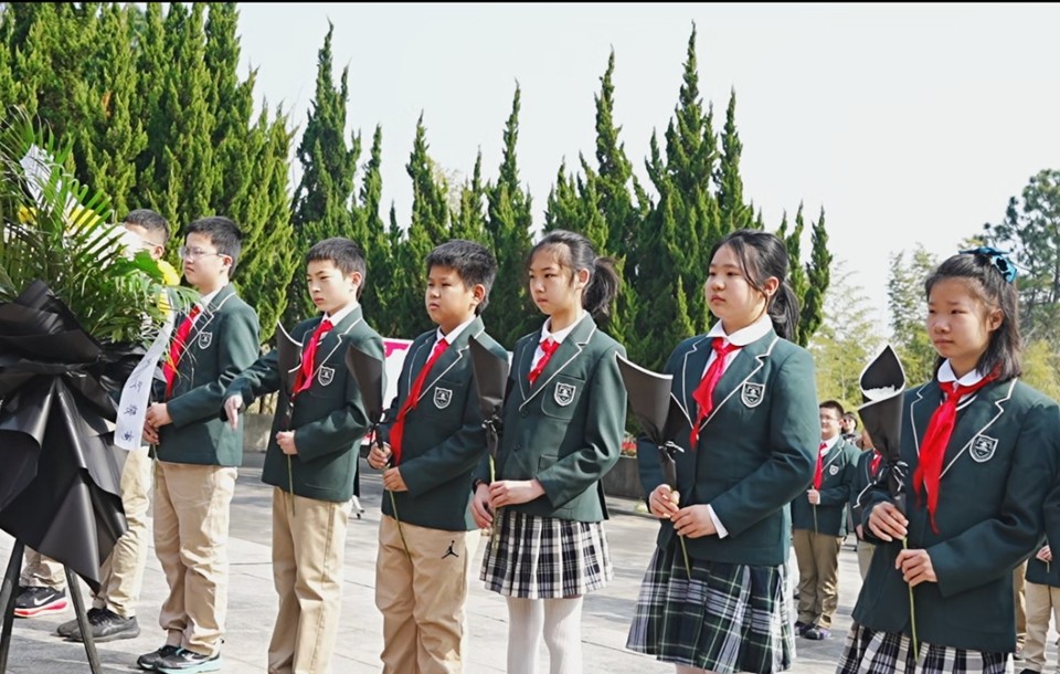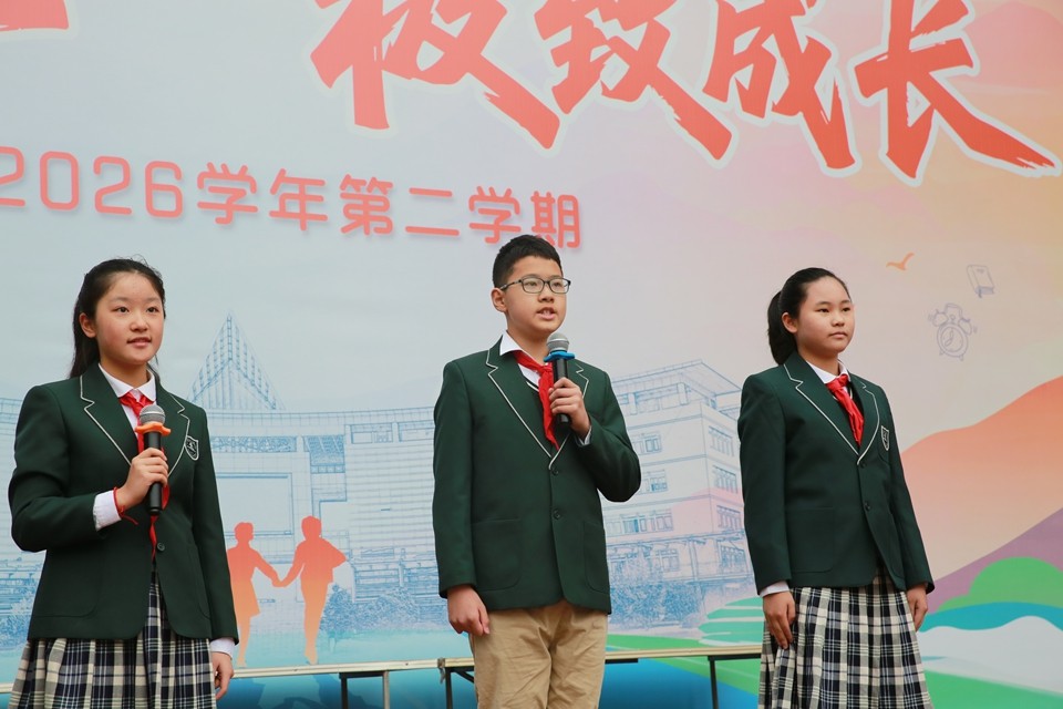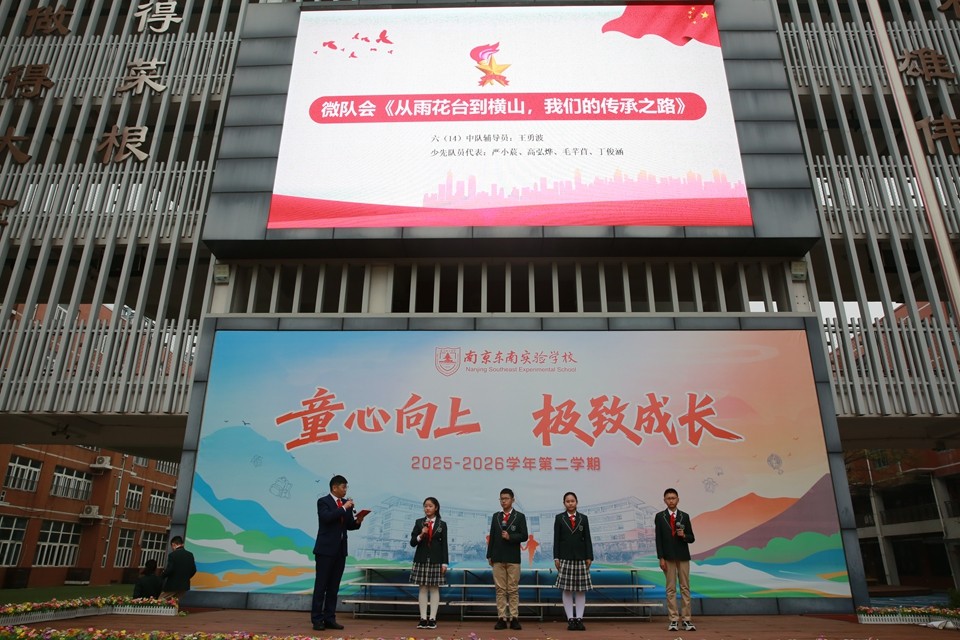 六(14)中队全体队员带来集体朗诵《在春光里成长》,将三年祭扫的心路历程一一呈现——从雨花台的高大群雕,到横山的青山松柏;从“知道英雄”到“懂得英雄”;从“被守护的人”成长为“想要传承的人”。大屏幕上,三年来的活动影像缓缓流淌,朗诵声时而深沉、时而激昂,令在场师生无不动容。