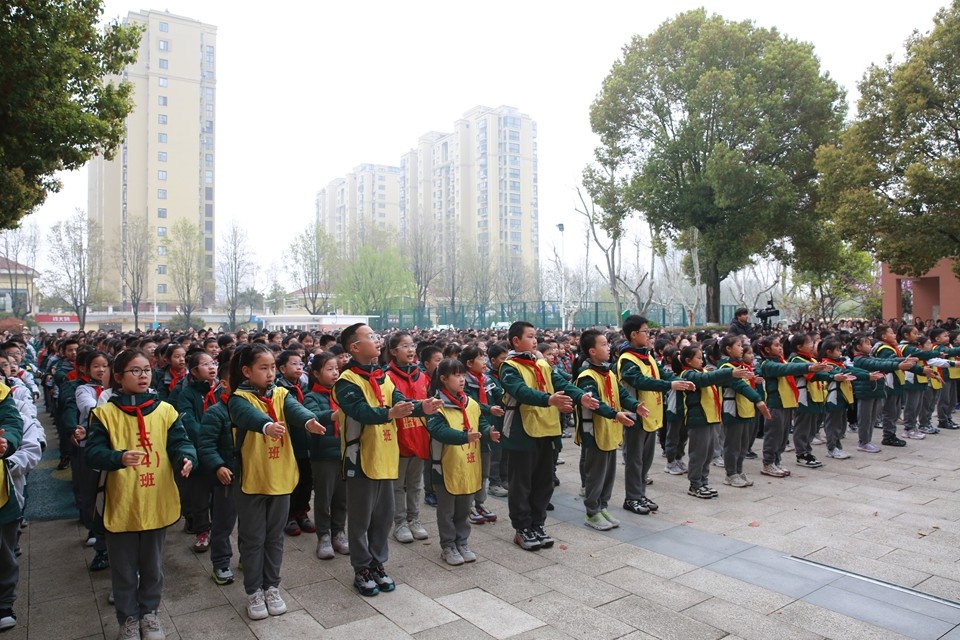 微队课结束后,六(14)中队带领全校队员齐唱《我们是共产主义接班人》。歌声响彻校园,唱出了新时代少先队员的坚定信念。大队辅导员刘云老师带领全体队员呼号,“时刻准备着”的呼号声在春光中久久回荡。