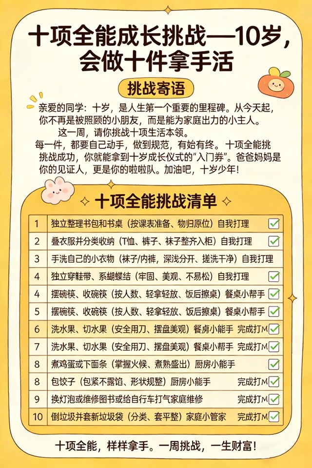 三年级组结合学生即将迎来的“十岁成长仪式”,创新性地推出了“十项全能挑战”,将其作为孩子成长的“入门券”。学校班主任和年级主任率先垂范,带领学生创编并练习具有年级特色的健身操,校园里洋溢着蓬勃的朝气。而面向学生的“十项全能挑战清单”更是在家长群中引起热烈反响。清单涵盖了从“独立整理书包”、“手洗小衣物”等自我打理,到“包饺子”、“煮鸡蛋”等厨房技能,再到“换灯泡”、“倒垃圾”等家庭管家事务,共计十项生活本领。学校希望通过这一周的挑战,让孩子们在动手实践中提升独立性、责任感与耐挫力,完成从被照顾者到家庭小主人的成长蜕变。