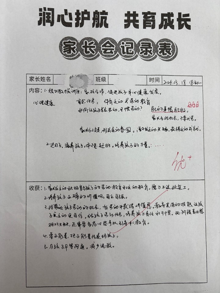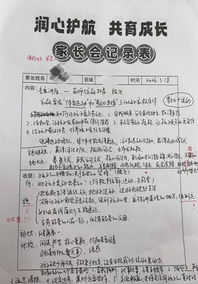 家长会的影响力最终延伸到了每个家庭。当晚,许多家长带着详实的笔记回家,第一时间与孩子分享会议精神。更有不少家庭以此为契机,召开了正式的家庭会议。在会议中,家长与孩子共同商定家庭劳动分工,制定每日运动计划,并将学校发起的“十项全能挑战”郑重地提上日程,孩子作为挑战主角,家长则承诺成为最给力的“啦啦队”和见证人。这一份份来自家庭的积极响应,将学校的育人理念转化为温暖的日常,让“健康第一”不再是口号,而成为了触手可及、热气腾腾的生活本身。
