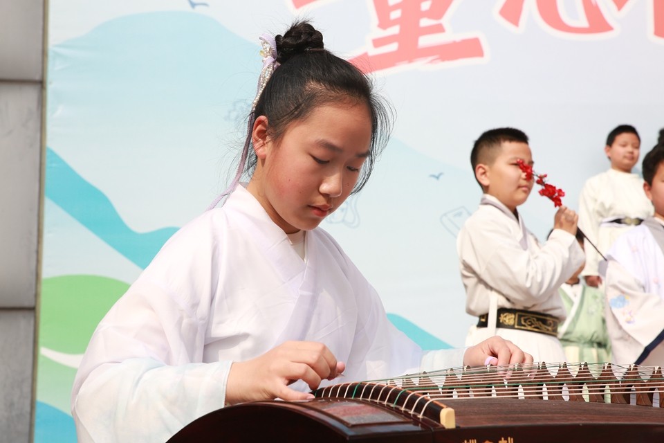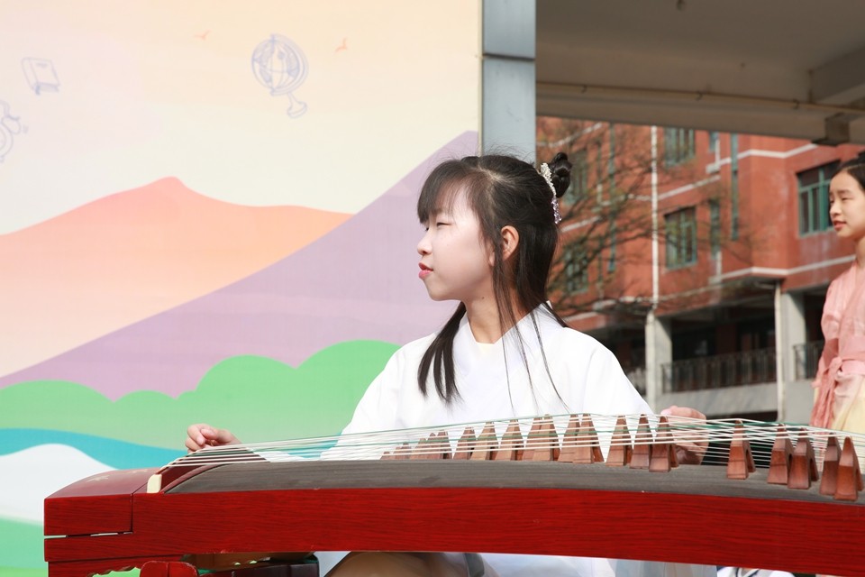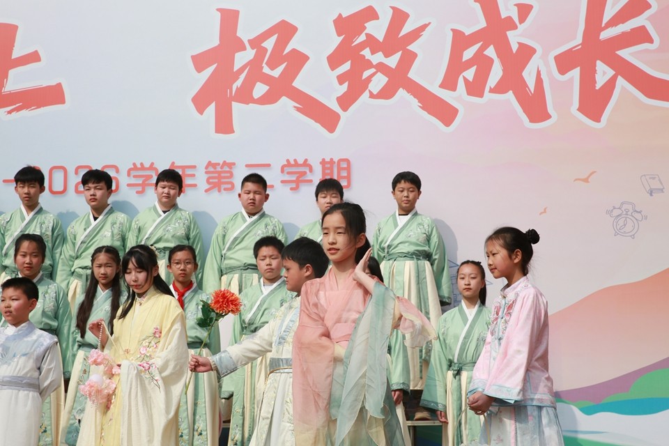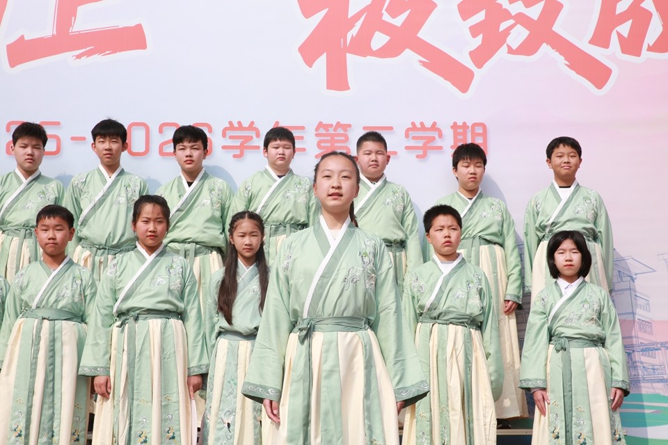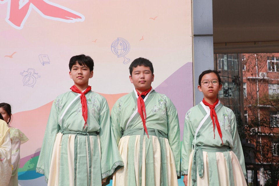 升旗仪式后,六(10)中队的队员们带来情景朗诵《十二花神》。一月梅花傲雪,二月杏花含羞,三月桃花灼灼……队员们以声传情,以诵达意,将十二花神的风韵演绎得淋漓尽致。字句之间,流淌着古典诗词的韵味;眉眼之间,传递着传统文化的温度。