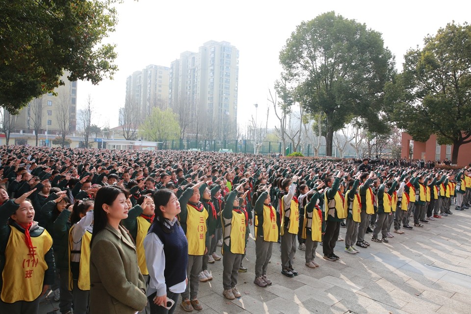 晨光熹微,旗帜飘扬。雄壮的《义勇军进行曲》响起,五星红旗迎着朝阳冉冉升起,全体师生肃然而立,少先队员行队礼,神情庄重。这一刻,爱国情怀在每一个孩子心中激荡,文明风采在整齐的队伍中彰显。