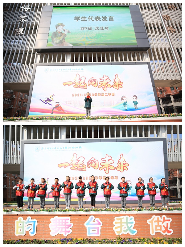 3月4日,小学部隆重举行第一学月军训总结暨颁奖典礼活动,小学部朱国军校长、校党委张蜀江副书记、江宁分校张士民校长为获得“威风虎”旗帜的49个班级颁奖。学生代表四(7)班沈佳琦同学发表感言,同学们听完分享,增添了军人的光荣感与使命感,共同唱响《强军战歌》,更加坚定:听党话,跟党走,不惧强敌敢较量,为祖国决胜疆场!